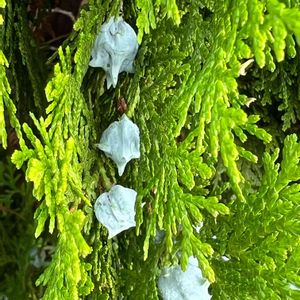 タタミイワシ(!)みたいに薄い板状に集まっている葉っぱにポチポチと実がついていているコノテガシワ🌿ヒノキ科 水色のコンペイトウみたいな実、口に入れたらミントの味がするのでは?と妄想してしまう😋 あ、でも食べられるという話は聞いたことがないので食べてません😅 ミントの香りもしないです。 でも見てるとなんだか癒される😊 緑と水色が目に優しい🌿夏のリース作るときに使えるかな?