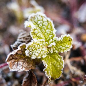 ハーブ(ミント系)です 日中はすっかり春なのに朝晩の気温はマイナスです 葉っぱに霜がビッチリ付いてます 温かい地方の方は中々見れないでしょう?(笑) 8日 葉っぱの日らしいのでアップします