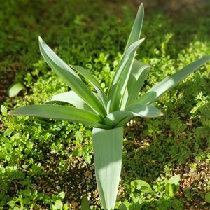「アリウム ギガンチューム」 今日のギガンチュームさん☺️ 発芽から1ヶ月、だいぶ葉っぱが広がってきました😆 花壇の奥の方に植えてあるので周りの雑草まで手が届かない😭これはこれで自然な感じでいいかな?