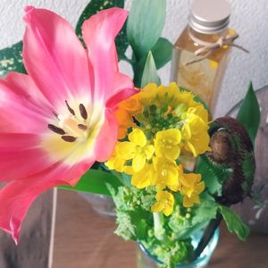 青空が広がって日差したっぷりで月曜日スタート❗ やっぱりお天気だと気持ちいいですね😊🍃 娘達は元気に半袖で登園しました👭笑 佐倉チューリップフェスタの掘り取り体験でお持ち帰りした🌷達~ 半分以上鳥にイタズラされて食べられたりしてしまったけどまだ咲いてる子も居ます🌈 八重咲きが好み🫶🩷 華やかでボリューミー🎶 .