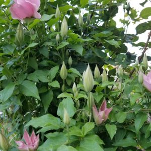 バラのデンティベス と クレマチスのピンクファンタジーのコラボ 同色どうしを仕掛けました バラか?クレマチスか? 良く見なくては判らないのが作戦です😆