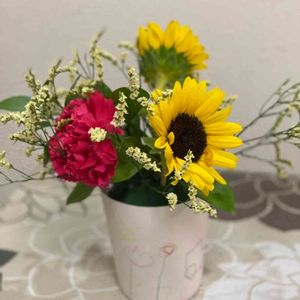 (娘宅にて) 孫の保育園では月に一度 保育の一環として日比谷花壇さんのご指導で花育を行っています𖡼.𖤣𖥧𖡼.𖤣𖥧⚘ 植物と触れ合うことで創造力や優しい気持ちを育むのだそうですᰔᩚ 自分で生けて植木鉢には オリジナルの絵を貼り付けて 素敵な作品が出来ました✨✨ 頑張ったネ(ꕤ*˙˘˙)⚘𓈒𖧷 ⁺.