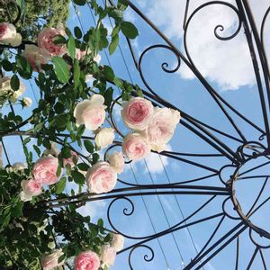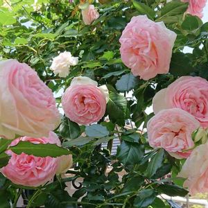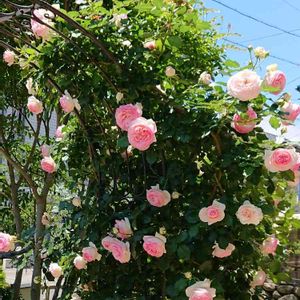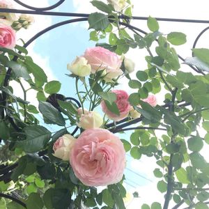 パーゴラの上で咲いてるピエール💕 カワユス😆 今日は咲き終わったモッコウバラやシジミバナの枝をカット✂️カット✂️😁 チョキチョキしすぎて手がつりそう😅