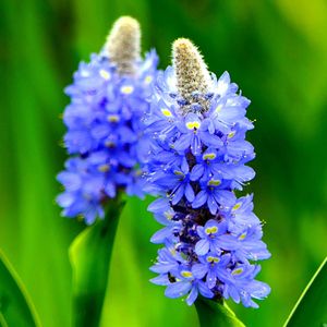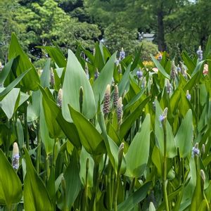 ポンテデリア ミズアオイ科ポンテデリア属の多年草。北アメリカ南部原産。水辺の浅瀬に生える水生植物で、多くは切り花で流通するが、最近は苗も出回るようになった。花期は6~9月。草丈60〜100㎝で、長く伸ばした茎の上部に厚みのある葉を1枚つけ、青紫色の小さな花を穂状につける。花は1日でしぼむが、10〜20㎝の花穂には多数の花がつき、次々と1週間ぐらい咲いていく。 出典『花の事典 970種』