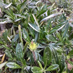 ベニハナトキワマンサクの垣根。 、、、と思っていたら、端っこ一本だけ白い花。少し黄緑色がかってる。