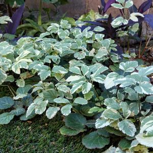 斑入りの岩ミツバ 去年の秋に、あっちこっちの日陰に植えてみましたが 冬は地上が枯れて、春に芽吹き ずっと綺麗で、明るくて感動しました😳