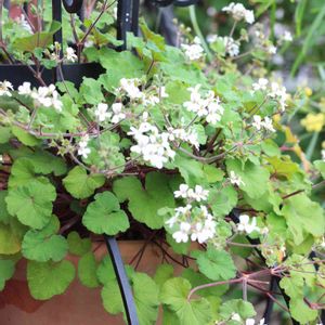 "ペラルゴニウムオーストレイル" 暑い中も休まず可憐で可愛いらしい白い小さな花が咲き続けています*¨*• (୨୧ᵕ̤ᴗᵕ̤) まあるい縮れ葉もかわいい♡ 春にご近所さんからいただいた一株が鉢いっぱいに広がってユラユラと涼しげです𓂃٭ 𓈒𓏸❁⃘