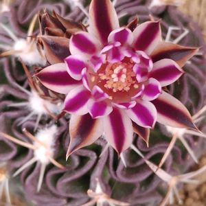 サボテンの縮玉ちゃんに お花が咲きました💜✨ 紫と白のバイカラー(ストライプ)のお花でとてて可愛いです 💜🤍💜🤍 縮玉ちゃんは見ての通りウェーブヘアです グリーンのウェーブヘアの中に 剣⚔️のような刺がついてて カワイイです 👍💫✨✨