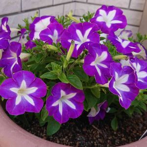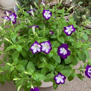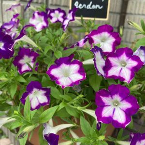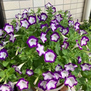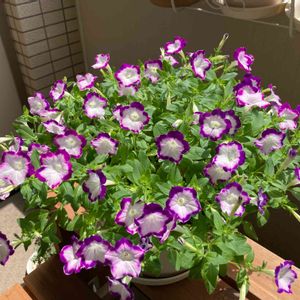 サフィニアアート江戸絞り、夏は、白が強くなっていたけど、ようやく綺麗な紫が出てきました〜😊あともう少し咲いてくれるかな💕