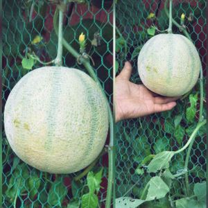メロンの大きさが分かるように撮って ( ∩'-'📷⊂ )とリクエストされました🍈 なので、お隣のご主人の✋と一緒にパチリ📷 鍵の掛かった🔓小屋で、りっぱに育つメロンでした🍈