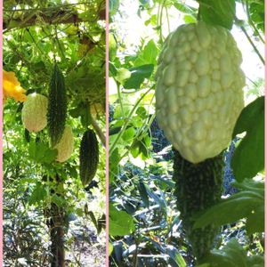 お隣さんのゴーヤです 右手の白いゴーヤを貰いました(*∩ω∩) 苦くないから、生で食べたらいいよだって(´;ω;`) あのぉ 苦いのですが😅 レシピ検索します(๑╯ﻌ╰๑)