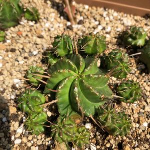 ユーフォルビア 選抜ハイブリッド No.3 管理名 丸鱗宝 鱗宝(mammillaris)♀×オベサ♂ 丈の短い鱗宝が作りたくて作出を続けている苗( ´•௰•`) 鱗宝は種がとても着くけど実入りのない不稔性のものや出来てもひと房に1個しか種が取れないなど中々曲者です( ̄▽ ̄;) 発芽率も更に低い、、、 交雑とはそういうものなんだろうなぁと思いながらいいものを出そうとおもってます。 この子は他の子と違い、両親のいいとこを半分半分持っているので今後に期待してます! タコ物のお化けみたいな樹形に鱗宝はなるのでこの子もまん丸から子供を伸ばして欲しいなぁ|ω・`)