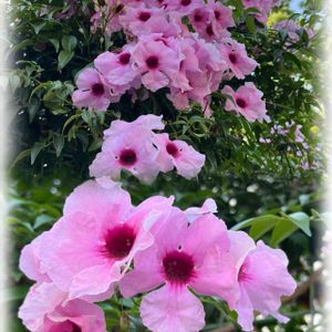 お出かけ先で出会った、パンドレアの花🍀 雨の日、怪獣君(3歳児)を迎えに幼稚園へ。 裏道を通っていると、塀の上に美しい花が咲いていました😊 急いでいたのですが、素通りできるはずもなく😅 初めてお目にかかりました。 雨に濡れ、しっとりと美しいパンドレアの花💕🍀 9/14のpicです🍀