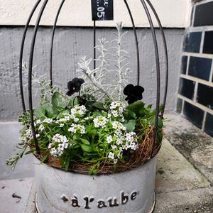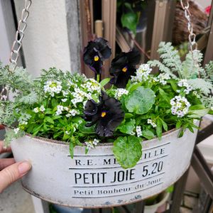 今期は中々黒いお花に出会えず ホムセンで弱々になってた黒パンジーを 見つけてお迎えしてみました🖤 元気になってくれるといいなぁ~😊 お気に入りのブリキに アリッサムとシルバーレースを 添えて…というか支えてもらいました😅
