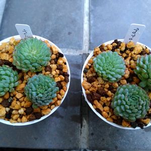 こんばんは😄 今日も濃霧で8時半くらいまで真っ白で前が何も見えませんでした😱 通勤通学時間帯、濃霧だと怖いですよね💦 車のライトが遠くで微かに光ってる?って感じでした😵 濃霧が晴れた後は黄砂で空が真っ黄色😫 黄砂ってこんな時期に飛んで来る!? クシャミが止まりませんでしたよ🤧 今日はお迎えした苗達を植え付けてました🎵 ①グロブローサとヴィンセントカトー 諦めの悪い奴でして😅 また懲りずにお迎えしました🤣 グロブローサとヴィンセントカトーって一緒と言う情報もあれば、ヴィンセントカトーはグロブローサの交配苗と言う情報もあるし、はっきりしない感じですが💦 個人的な考えですが、何度も何度も購入して育ててきたから思うんですが🤔 グロブローサは葉が全体的にぷっくりとしてて、カトーさんは葉裏がぷっくりしてる感じ。 肩から爪までの形も分かりにくいけど2つとも微妙に肩の形が違う。 花が違うのだろうか? 咲かした事なく秋になれば全滅するので見た事なくて🤣 あくまで個人的な考えなので信用しないでくださいね💦 ②ロメオ うちのオマケで頂いたロメオ実生がやはりロメオに思えなくてお迎えしました😂 小さい方はオマケで頂きました🩷 ③プレミアムジェニー この子はオマケで頂きました🎵 名前付きで頂けるのは有り難い😆 デベソだったのでもぎって葉挿ししました😜 ④紫式部 (サボ相さん苗で、葉挿しっ子かカキコ) お安いのあるかなと思って検索したら掲載されてる写真が良い感じのサイズで、写真撮られた日も経ってなかったのでお安かったしポチッたんですがね😓 届いたらシワッシワでして😰 根っこもちょっと枯れてました💦 え、この状態で売る? 私なら絶対に売らんわ😤 メルカリあるあるなんでしょうね、私はシワッシワの苗で届いた事なくて😮💨 ま〜、憧れのサボ相さんの紫式部が手に入ったから良いわ🤣 トラブル起きたりしたら嫌だから評価は良しとしましたが😅 ⑤今日植え付けました👍 何とかグロブローサとカトーさんを春までにしっかり育て上げなければ🤣 もう次は無い😱
