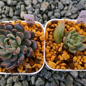 こんばんは😄 今日は… 昨夜、雨が激しく降り、止んだと思ったら暴風で雨戸のシャッターが風でガシャンガシャンとめちゃくちゃ煩くて寝不足の1日でした🥲 今夜からシャッターの対策しましたよ😮💨 静かに寝れるわ😪 今日は届いた苗を植え付けました🎵 ①桜鬼 夏に1cmの葉挿しっ子を枯らしてしまって2つお迎え😜 それぞれ別の出品者さんからです😉 ダメ元で小さい方の親葉をまた芽が出るかもと挿してます😁 ②はじまりの花 小さい方の桜鬼の葉挿しっ子と一緒に綺麗でしたから購入😊 ③メープルハニー オマケで頂きました🙌 確かメープルハニーってほのぼのさんの苗でしたっけ? この出品者さん、とても太っ腹😤 ④青鬼、赤鬼 桜鬼の大きい方と、この青鬼赤鬼の鬼シリーズ3点セットを購入😊 どれも綺麗で元気な苗でした🎵 3点セットでお迎えできて良かったです🥰 ⑤青鬼、赤鬼 先住人の昨年購入したこの2つ😅 今回お迎えした子達との大きさの違いよ🤣 夏に成長点を焦がしたから、むしって子吹きさせました😂 あまりにも小さいから秋に肥料入れて植え直し😅 元気に育ちますように🙌 私は基本、持ってたら同じ品種は買わないんですが、桜鬼を探してる時に3点セットで販売してるのを見つけてしまって😂 迷ったけど、先住人が小さいし、桜鬼が大きかったから買っちゃいました😜 頑張って育てまーす👍