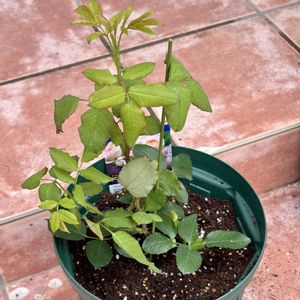 (メモ)2025/04/22植付け 河本バラ園 シュクレ 今朝、つぼみを確認 楽しみです 葉っぱと葉っぱの間?が長く シュッとスマートな佇まい 棘は尖そう
