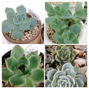 エケベリア属の多肉たち 右下のこたちは 名前の分からないエケベリアです 根のないこたち10個姉にいただいて寄せ植えにして育てています 他の3つも姉にもらったんですけどね~ 花のように見えるエケベリア属たちを見てると 可愛いくて~😊💚🎵
