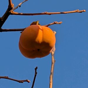 畑のカキです。 葉っぱがどんどん落ちています。 1コしか見えなかった実ですが どうやら2コあったようです。 葉っぱが落ちて見えるようになりました。 それにしても今年は少ないです。 あと我が家の畑を縄張りにしている ジョウビタキがカキの木の上で辺りを見張っています。 真下から撮れたのですが、 何だかよく分かりませんね。