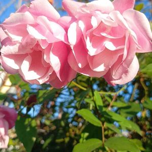 🍀おはようございます🍀 昨日の良く晴れた日の庭の薔薇 オールドブラッシュ🌹🩷 庭の柿の木にはまだ実が😁🤭 薔薇と柿のコラボ💕😁🤭 ②5センチ位の茎を✂️… 挿し芽していたアリッサムに 新しい蕾が付いて♬ ③地植えのオダマキの葉っぱ🌿 いろんな色が混ざり合って綺麗♬ ④掘り上げて保存していた 八重咲きアネモネ 凛々花を 10月に植え付けて… グリーンの葉に(*'∇'*)ワクワク ⑤デルフィニウムの昨日の様子です 花色が薄くなりました!