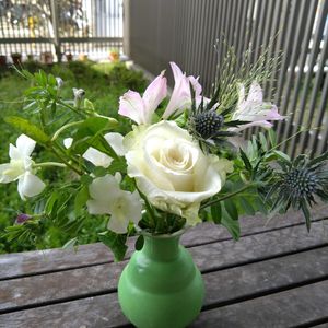 サブスクのお花に入っていたグリーンが気に入らなかったので、またまた庭の雑草たちが助太刀に登場。 カラスノエンドウとか、柔らかい雰囲気を出してくれるので好き💓