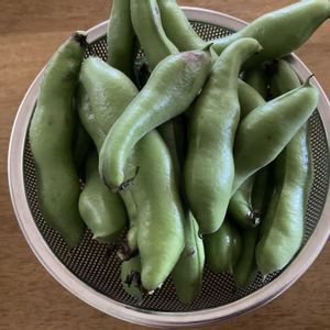 そらまめが無事に育ってくれました。 アブラムシがびっちりついてしまい、慌てて殺虫剤をしたから心配でしたが、こんなに大きくなってくれました♪ もう少し待ってるとカラス🐦⬛にやられちゃうみたいなので、(数本食べられてる😅) 大きいのは収穫してきました。