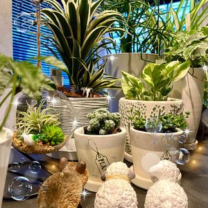 フィロデンドロン バーキン仲間入りしました〜🌿お気に入りのリーフたちと記念撮影 (*´`*)💞 ⬅️社会人一年生の息子からの誕生日プレゼ ントの🌿ドラセナ チャオ 奥には、🪴ポトス エンジョイ 🪴シュガーバイン 🪴ミルクブッシュ 🪴オリズルラン フィロデンドロン バーキンは株が3つあって、ぶら下げてもいいようになってました もしかして、垂れ下がるタイプなのでしょうか?🙄 新緑に美しい線状の斑が入り、古くなると 緑に変化するようです 花言葉は、『華やかな明るさ』『壮大』