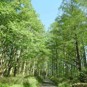 今朝の散歩道です。 新緑が綺麗でした。 メタセコイアの森の遊歩道です。