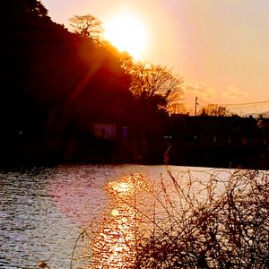 散策中、仁保川沿いでもう直ぐ日没、水面に写り込んでいる夕陽が綺麗でした。