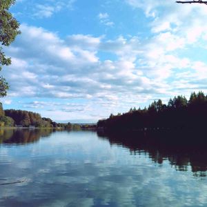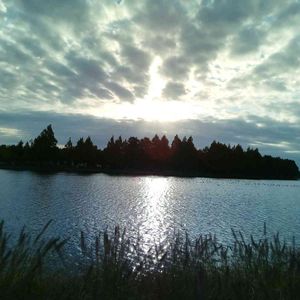 朝の散歩道。 水元公園、水辺の風景、水面に空が写り込んで、綺麗でした。