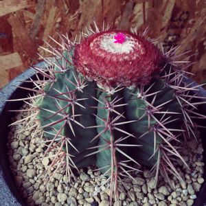 メロカクタス 青嵐雲(せいらんうん):水色の肌が美しいサボテン。 サボテンがある程度成長すると帽子みたいな花座が現れるのが特徴で、花座が出来ると、サボテン自体の成長は止まるそうです。 花座の上に2つある蛍光ピンクな花芽?種??が目にみえて、モンスター度を増してました👾✨ あ✨花座の縞が年輪のように花座の樹齢を表してるそうです💡