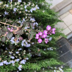 通りがかりのマンションの植栽にて。 ご教示いただきました。 コバノランタナ(小葉のランタナ)ですか。 あのどこにでも野性化してる強靭そうなランタナの近縁種だったのですね。言われてみれば葉っぱとかはランタナそっくりですが、花序や枝ぶりはずっとおとなしめですね。花色のおかげか、清楚感さえも。