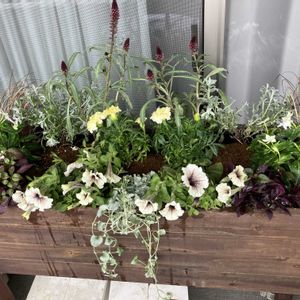 . 先日、ずっーーーと行きたい!と思っていたフローラ黒田園芸さんへ行ってきました! あいにくの…暴風雨🌀の日🤣 それでもたくさんお客さん来てました…さすが人気の園芸店。 そして欲しかったベンチ風プランターもゲット出来ました!! おチビvr.も欲しかったんだけど、まさに作成中だったので、また次回のお楽しみにとっておきました(笑) もうほんとに素敵な園芸店で絶対また行く!! . さて、素敵なベンチプランター。 せっかく植えるなら…と、黒田園芸セレクトの寄せ植えセット買ってそのまま植えました😁 可愛いに決まってる🩷 少しずつみんな大きくなってきて、いい感じになってきました! これから楽しみ😊 あぁ、早くまた行きたい… . #ユーフォルピアダイヤモンドダスト #ヘリオトロープ(香水の花) #ペチュニアvivaカプチーノ #妖精のチュチュ #サルビアネモローサ #フレンチラベンダーバンデラ #シルバーフォールダイコンドラ #ニゲラ . #黒田園芸 #ベンチ風プランター #ベンチプランター #寄せ植え #お花のある暮らし #今庭