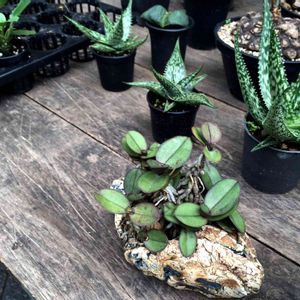 追記 ※beeさんが何かを発見してくださいました!おそらく、Doritis pulcherrima (small form) です!スモールフォームって。完全にわかった訳ではないので、タグ付はしないけれど、合ってると思います。 探してくださった皆様ありがとうございました! 更に追加 調べたところ、タイ北部では岩肌に着生してる野生プルケリマがいるそうです。岩っぽい鉢、オシャレ!と思ってましたが、理にかなった仕立てだったんですね〜さすが、タイ! ============ この葉っぱしかない、石鉢にくっついてるのは何か判る方、いらっしゃいますか?葉っぱ可愛くて、いつか欲しいんですが、何か全くわかりません。ランだとはおもうんだけど。