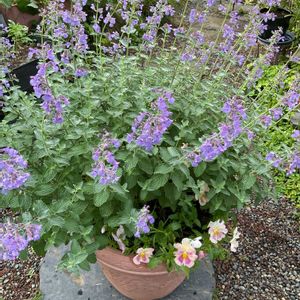 雨上がり☔️ ネペタ ウォーカーズロー💜が 満開で 薄紫色が 綺麗です💖✨ プラスチック鉢といえど、大き過ぎる鉢で 重く、主人に 持ってもらって 撮りました〜‼️ 3枚目: 斑入りノシラン 4枚目: これも 斑入りの微妙な色が 素敵な、観葉植物🪴 まだ、 小さな鉢で 推移中〜の トラデスカンチア ナヌーク🌿です❣️^_^ 今日は 日曜日💓 ゆっくりします〜‼️^_^