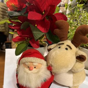 こんばんは☺️ 久しぶりにトナカイとサンタ🎅を飾ってみました😌後ろのポインセチアさまの葉、よく見ると👀丸みのある可愛い形をしているんですよ❤️❤️❤️❤️