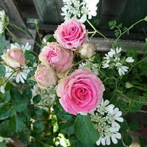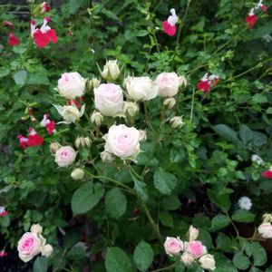 モンテカッシーノ 5月だけ、房咲きになってくれます。 サーモンピンクのミニバラさんです。 でも、中輪咲きなので、 普通のバラと変わらない艶やかさです! フォーエバーローズはロングライフで大好きです🌸 後ろの方で、ミミエデンちゃん、 ひょっこりはんしてます|ω・)