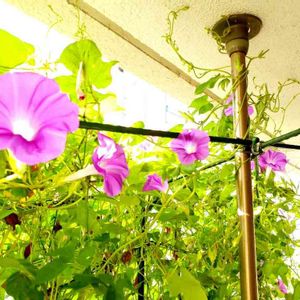 今年のグリーンのカーテンは朝顔で挑戦‼️ もうカーテン欲しいくらいの日差し❓ 多肉さんにも日陰作ってあげないとね❣️