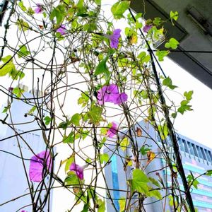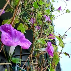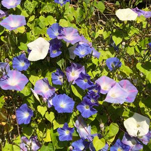 会社のグリーンカーテンのヘブンリーブルーがようやく満開になりました。寒くて昨日の花が残っていて不思議なグラデーションです。