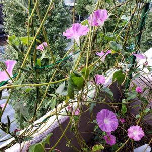 グリーンカーテン用に 長男に西洋朝顔を育てて もらってます😃 右は夫が育てているレタス これから間引きします🌱