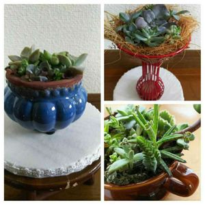 器が気に入ってる寄せ寄せ~(#^.^#) 赤はcandlestand 茶はcoffeeserver 青は普通に鉢(笑) 質問です…… ↘のツンツンした多肉さんの 先端に葉っぱらしきものがでてるんですが…… これは芽🌱❓❓ でもツンツンしてないけど(..) 解る方教えてください できれば名前も……(^^;