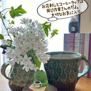 今朝も僕のティータイムを。 あやのカップも写ってるね。 益子の陶器市で買ったんだね。 アリウムの白いお花 可愛くて大好きだな。