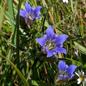 ホソバリンドウ 秋の湿原に咲く 美しく青きドヨウ🏷 開花してまもない間は雄しべは雌しべを包んでいる🔷しばらくすると雄しべは外側に倒れて、雌しべの柱頭が2つに割れるのは雄性先熟のお決まりやね♡ 晴れた日にしか開花せず、花弁に染みのように見える緑色斑点も光合成を受け持つようだ🟩 葉は名前の通り細く、茎はやや赤みを帯びていて、葉から続く稜が見られた🟥 他の草にもたれかかるように低くあることが多いけれど、鮮やかな青はそれなりに目立つ💙