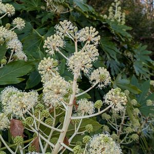 ヤツデ 紅葉の足元で蕾をたくさんつけていた 今日のGSの花🏷 花軸の上部の花序から咲き降りる(*´`*) 丸くドーム状になった小花はみんな雄しべも雌しべもちゃんとある両性花で、一つの塊としては下から上に咲いてポンポンになる˗ˋˏ❊ˎˊ˗(2枚目) 花弁や雄しべが落ちたあとの丸い子房の先に、地味に雌しべがツンツンと突き出ているのは雌性期で、これは移行する花序🩷 下部にドングリのような形の雌性期に入った姿もある♡ 別に雌花があるわけではない(3枚目) ★下部にある遅れて咲く花序は、雌しべが発達しないので雄花と称されている‥‥ ◎けれども、上の花序が結実して、受粉の可能性が少ないのでエネルギーを温存しているバックアップ部隊、つまり始めから雄花の形質を持って生まれたのではないと思うのですよね(^_-) 葉が8枚に裂けているのを見つけるのは難しい八ツ手です(๑´∀`๑)(4、5枚目)