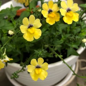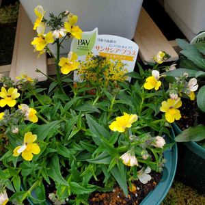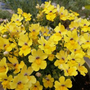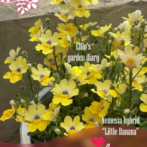 サンサシアプラス リトルバナナ (ゴマノハグサ科ネメシア属) 南アフリカ原産 開花期 春と秋 色鮮やかな一年草のネメシアと宿根草ネメシアのハイブリッドとして改良された人気のバイカラーシリーズ 一年草ネメシアの発色の良さや花つきの良さをそのままに 最低温度がマイナス5℃まで耐えられるように改良されたハイブリッドネメシアです 花びらの表側は元気の出る鮮やかな黄色💛 うらがわは赤紫色の花脈があり 風に揺れるとそれが見え隠れしてとても美しいです