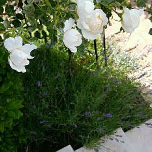 白バラ、サマーメモリーズの下には、耐暑性のラベンダーを植えています。 うまく撮れませんでしたが、満開なのです。
