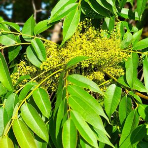 秋に真っ赤に紅葉する櫨の木に 小さなお花がたくさん咲いています。