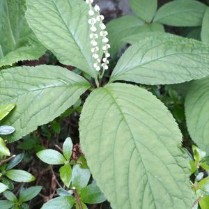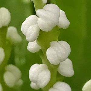 フタリシズカ 二人静の花が咲き出しました🌼 花と言っても花弁も萼も有りませんが… 一人静の花と言い不思議な花です🌼 真っ白な米粒みたいな花を一茎に数個つけます。 雄しべが3本あってこの3つの雄しべがくっついて雌しべを包んでいるんだとか🧐 二人静は一人静が静御前の舞に例えたのに二人静は静御前と亡霊トカ😱 我が家の二人静 三人官女に4人と5人囃子まで ④一人静の花 ⑤一人静の種ができました🟢