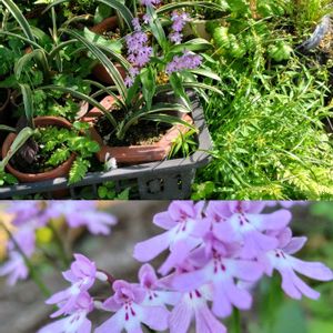 昼間の徘徊 ①2本あるさくらんぼ1本がヒヨドリに綺麗に食べられちゃいました😭 ②白花シランと紫蘭 ③オオツルボの花が大きく広がっていました。葉を小さくした 雪の下の盆栽です ④石化シノブの猫のしっぽです。 ⑤柿の木に吊るしてある 石化シノブ