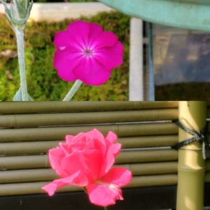 おはようございます😚 ①今日の朝くらいに咲いているかな と思っていたらやっぱり咲いていたバラ🎵スイセンノウはあと2日ぐらいかなと思っていたら 今日の朝咲いていました ②ゼラニウム ③紫ツユクサ も発見 白と青の混ざったニオイバンマツリ ④沖縄スズメウリのこぼれ種です。